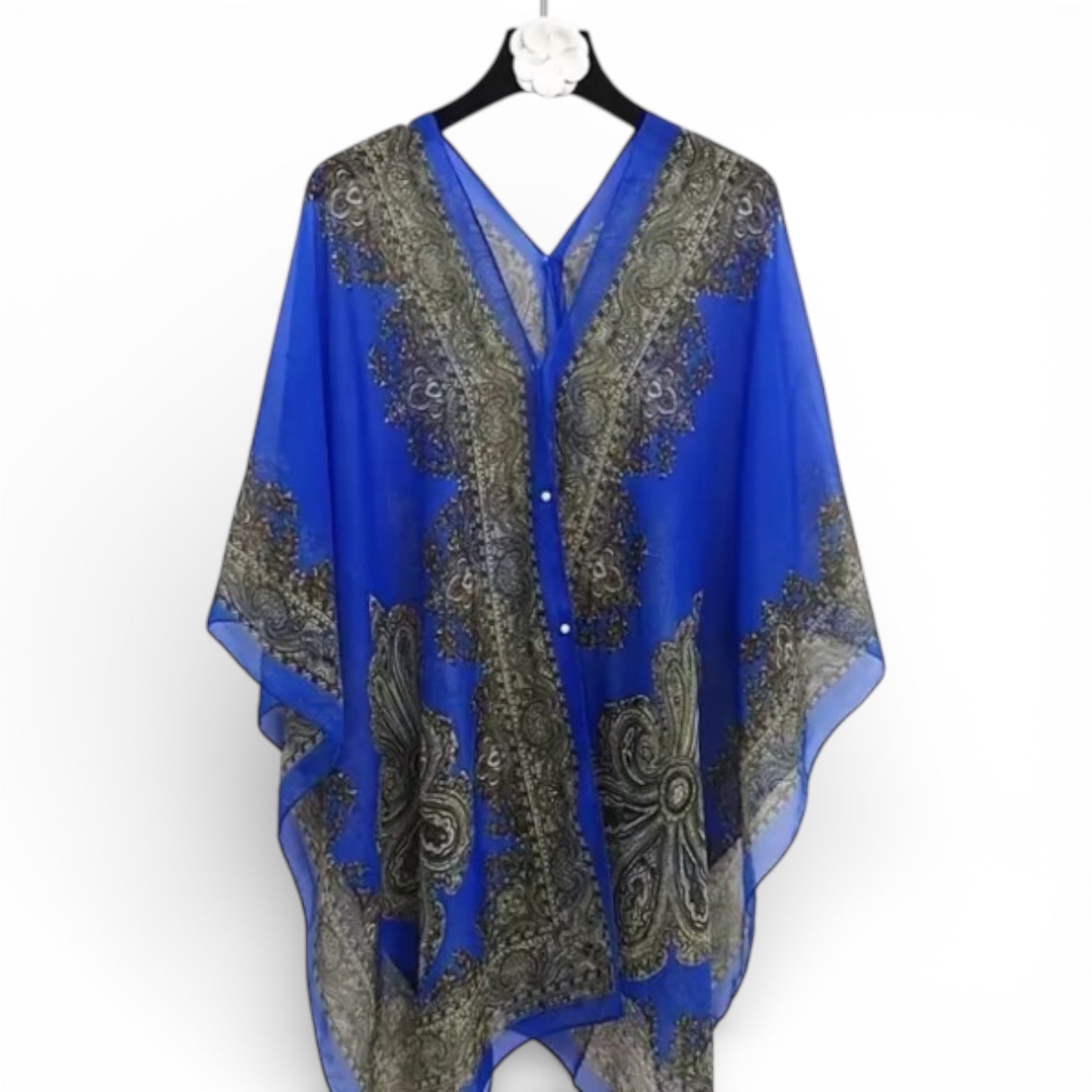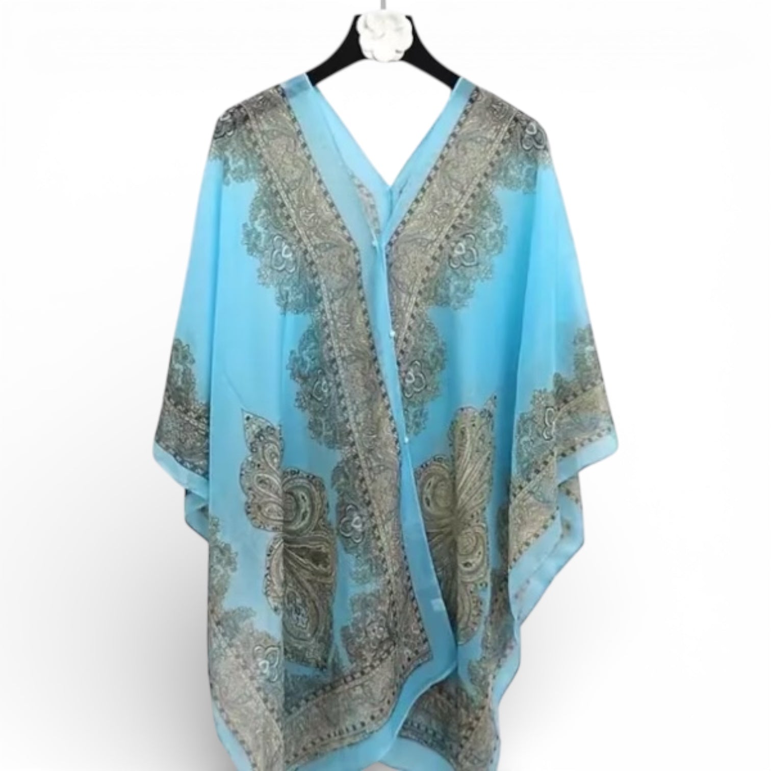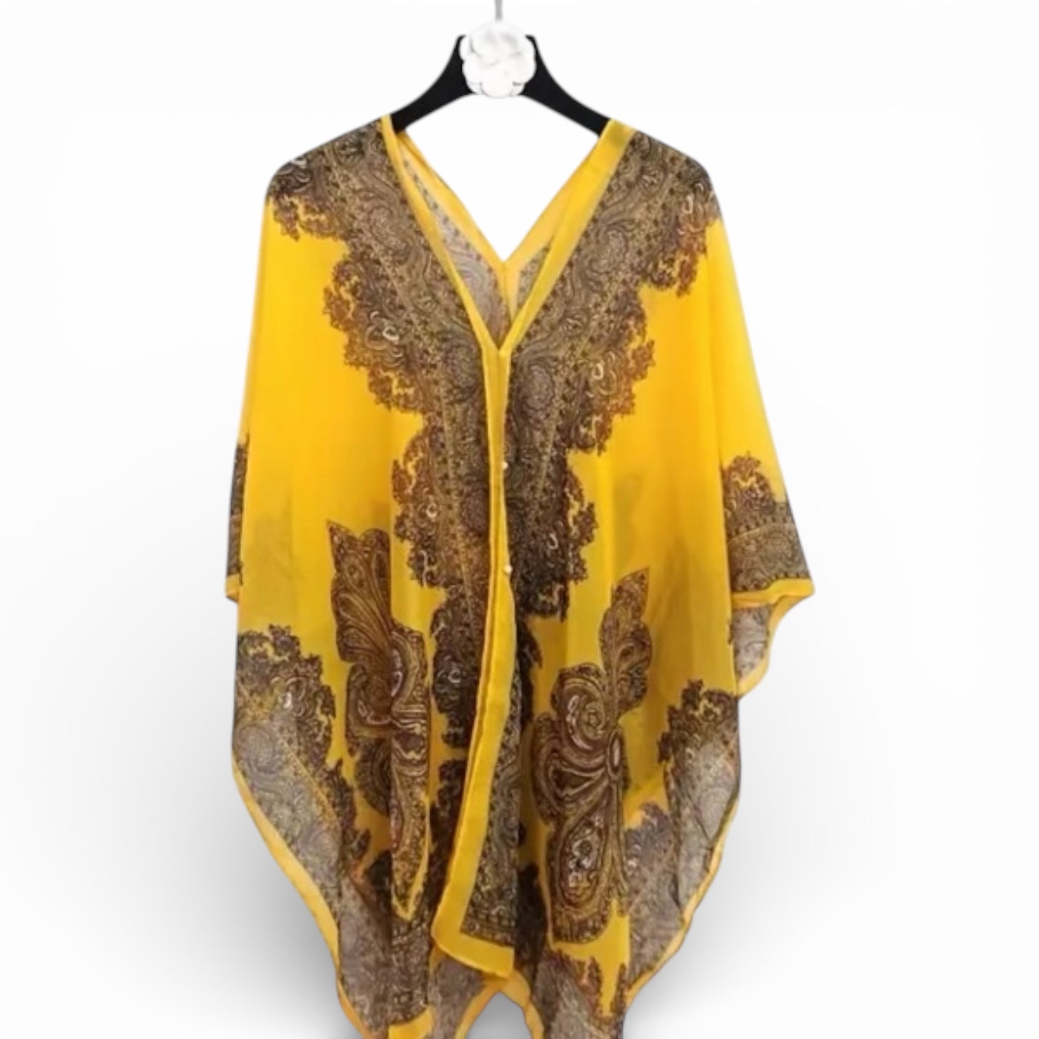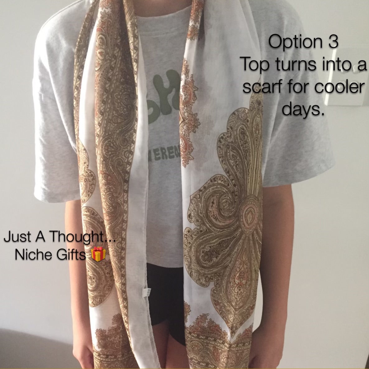 This top packs a punch. 3 in one convertible top. Feature elements that allow to be worn in multiple ways, such as a short top, which can be worn with a skirt or pants, a longer top, as shown below to wear over bathers or leggings, or as a scarf for the cooler months. Simple pearl buttons, you can dress this top up, or down. Great to take on holiday, light weight material, 100% polyester, and can be gently washed and will dry quickly. Check out the images below to see the way the top can be used. A versatile top at a small price. Several colours to choose from.